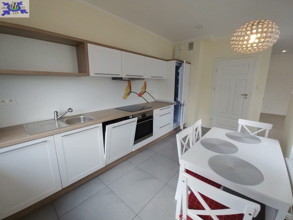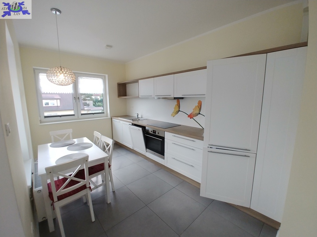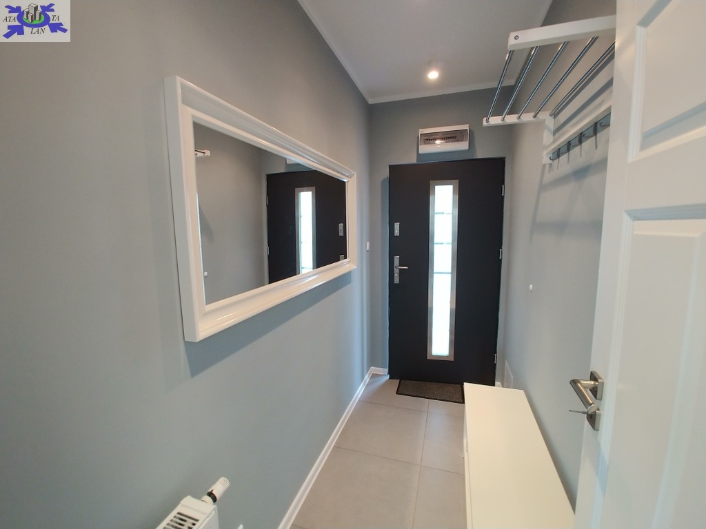Mieszkanie składa się z salonu (panele podłogowe, ściany wyszpachlowane na biało farba Dulux/antyczny marmur, lampy) z kuchnią z oknem (meble kuchenne w zabudowie, lodówko-zamrażarka, elektryczna płyta grzewcza, piekarnik elektryczny, okap kuchenny, zlewozmywak, zmywarka), przestronnej sypialni, wiatrołapu, łazienki z oknem (wanna, kabina prysznicowa, dwie umywalki i wc, jest możliwość doposażenia w pralkę), balkonu i wc ( ustęp, umywalka). Dodatkowo przedsionek oraz na dole do dyspozycji mieszkańców wspólny kawałek ogródka.