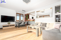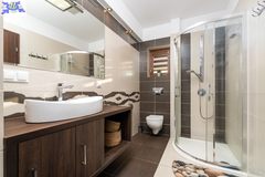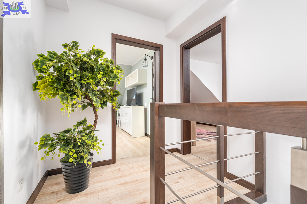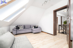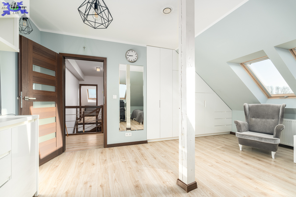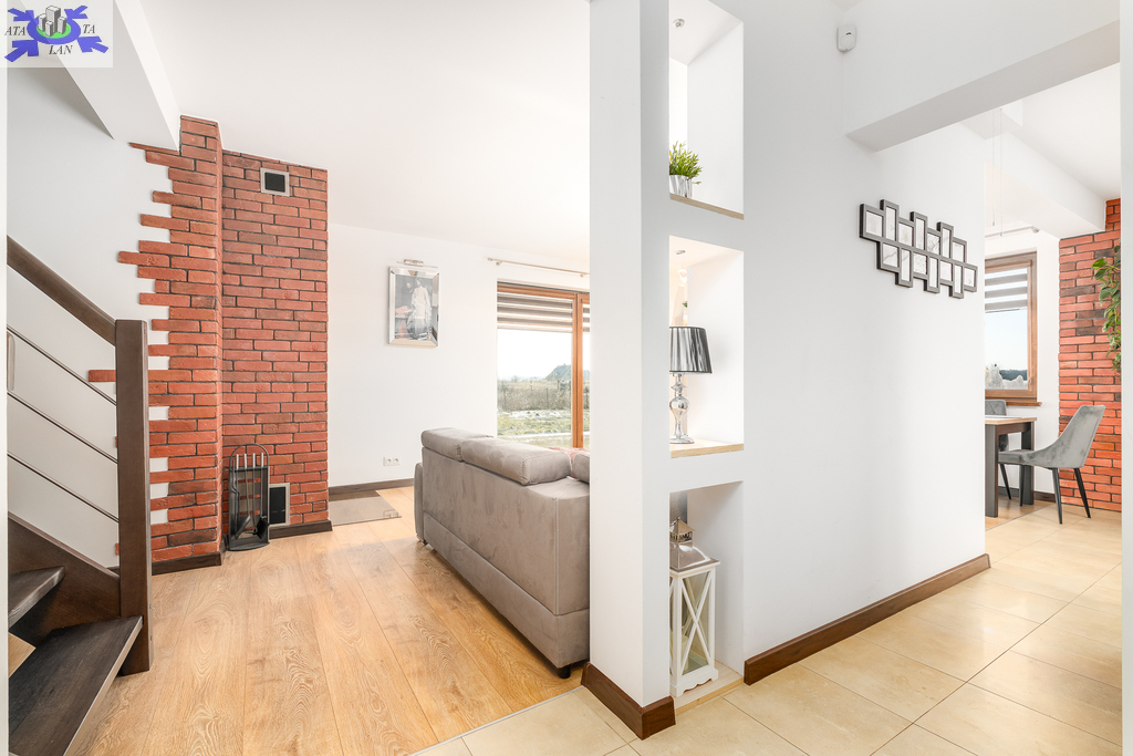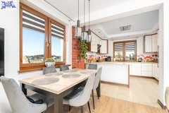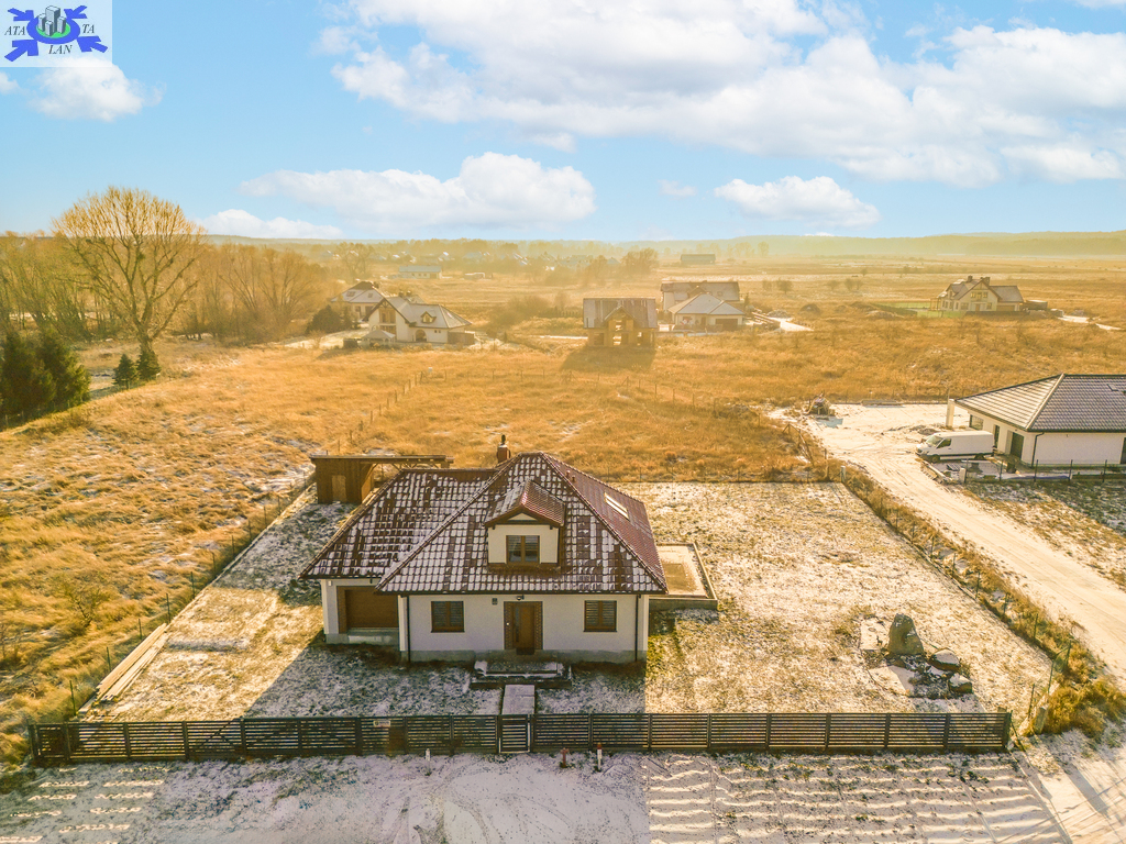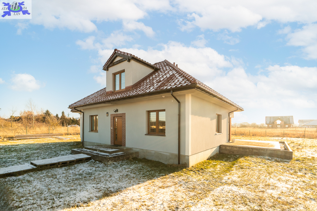 Powierzchnia użytkowa 144,50 m2 (całkowita 214,2 m2). Konstrukcja Solidny pustak ceramiczny SILKA, dachówka ceramiczna, stropy żelbetowe. Izolacja Bardzo wysoki standard termiczny (styropian 16 cm, wełna mineralna 20 cm). Układ Na parterze przestronny salon, kuchnia z jadalnią, dodatkowy gabinet, łazienka z pomieszczeniem gospodarczym i garaż. Na poddaszu trzy komfortowe sypialnie i duża łazienka.Bezpieczeństwo system alarmowy, monitoring i videodomofon.Ogrodzenie Cześć frontowa domu - automatyczna bram wjazdowa, furtka - panelowe ogrodzenie metalowe malowane proszkowo, reszta działki - wzmocniona siatka ogrodzeniowa.Media Budynek podłączony do sieci energetycznej, wodociągowej oraz miejskiej kanalizacji sanitarnej, dostępny także gaz (złącze przy działce).