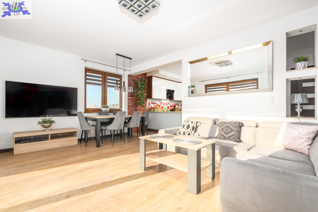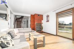 Kuchnia na wymiar Zaprojektowana pod indywidualne zamówienie, wyposażona w pełne, nowoczesne AGD. Panoramiczne przeszklenia Salon "wychodzi na zewnątrz", zapewniając doskonałe doświetlenie i poczucie przestrzeni. Kominek z DGP W salonie znajduje się kominek z systemem rozprowadzenia ciepła także na piętro - idealny na zimowe wieczory jako klimatyczny i alternatywny system grzewczy.Pełne umeblowanie, w przedsionku i sypialniach przemyślane zabudowy na wymiar, szafy i garderoba.Drewniane, ażurowe schody na piętro.