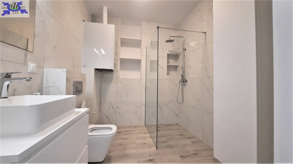 - łazienka (6,6 m2), wyposażona w kabinę prysznicową.