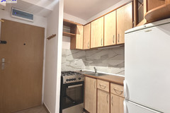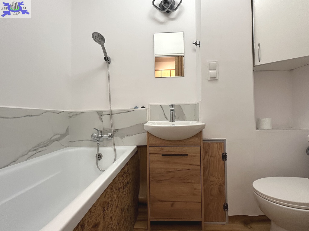 Lokal składa się z pokoju dziennego z aneksem kuchennym, wyposażonym w meble w zabudowie oraz lodówkę, a także łazienki z wanną, pralką, umywalką i WC. Okna PCV. Ogrzewanie oraz ciepła woda z sieci miejskiej.