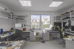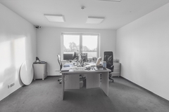 Jasne pokoje biurowe z dużymi oknami zapewniającymi dostęp światła dziennego.