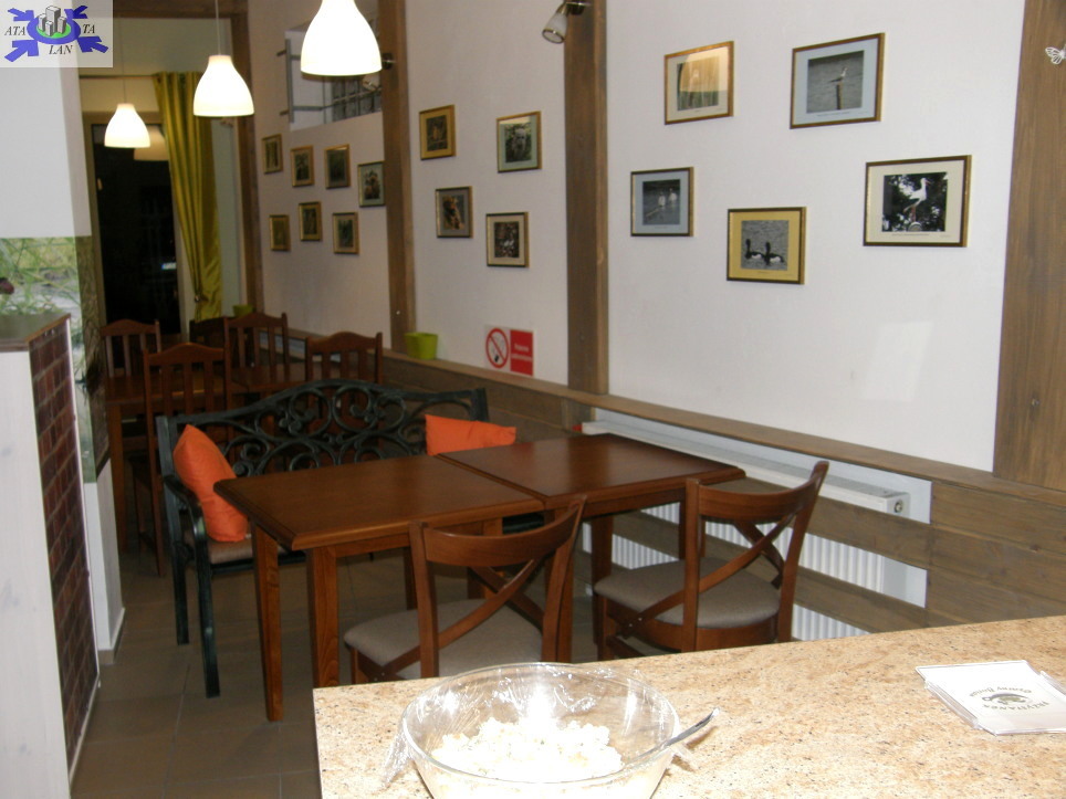 Pomieszczenia kawiarni 65 m2 w tym klimatyzowana sala konsumpcyjna 34 m2, WC damskie i WC męskie dla klientów 6,7 m2, zmywalnia 2,2 m2, kuchnia 10 m2, obieralnia 2,9 m2, pomieszczenie socjalne 2 m2, WC dla pracowników 1 m2, kotłownia 5 m2 drzwi wejściowe do sklepu i kawiarni aluminiowe z szybą antywłamaniową,