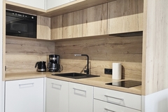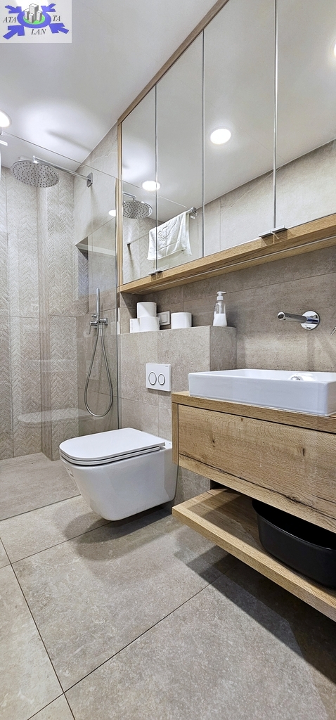 Apartament jest nowocześnie wykończony i wyposażony (, z przestronną łazienką oraz kompletnie wyposażonym i umeblowanym aneksem kuchennym . Ogrzewanie i gorąca woda są z sieci i ich koszty wliczone są w czynszu. Dodatkowym atutem jest klimatyzacja.