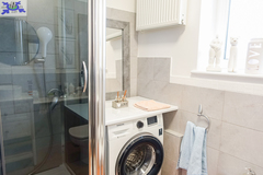 * mała łazienka z oknem i prysznicem oraz z WC. Przejście do garażu, w nim pralka i szafy na buty.