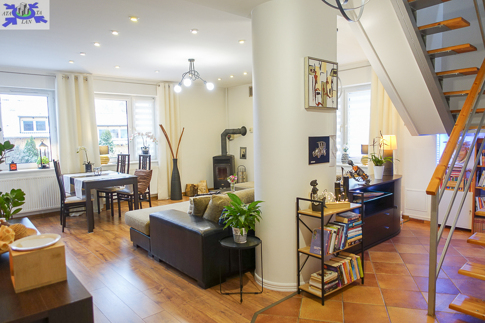 * salon 37 m2, otwarty na hall, pięknie doświetlony, z miejscem na wypoczynek i jadalnię, widok na ogród, wyjście na balkon i stamtąd kilkoma schodami do ogrodu, kominek z płaszczem wodnym uprzyjemni zimowe wieczory, ciepło rozprowadzane jest w całym domu.