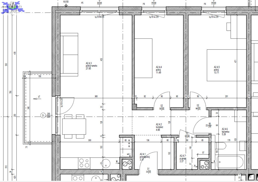 salon z aneksem kuchennym o pow. 27,8m2sypialnia o pow. 11,49m2sypialnia o pow. 13,71m2 łazienka razem z WC o pow. 5,28m2 pomieszczenie gospodarcze o pow. 2,27m2 korytarz