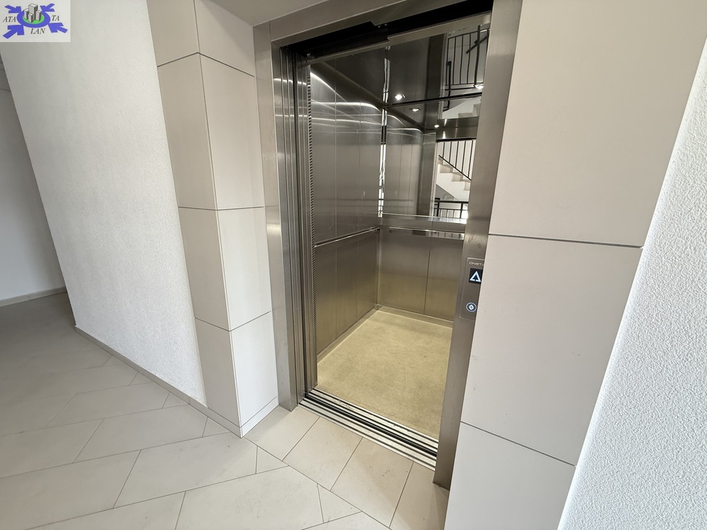 Winda zjeżdża do hali z miejscami parkingowymi.