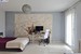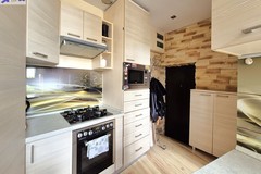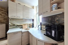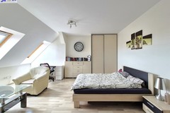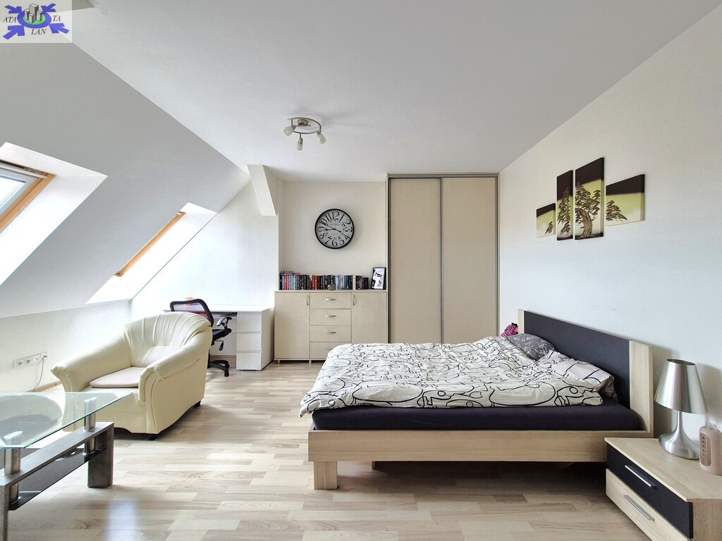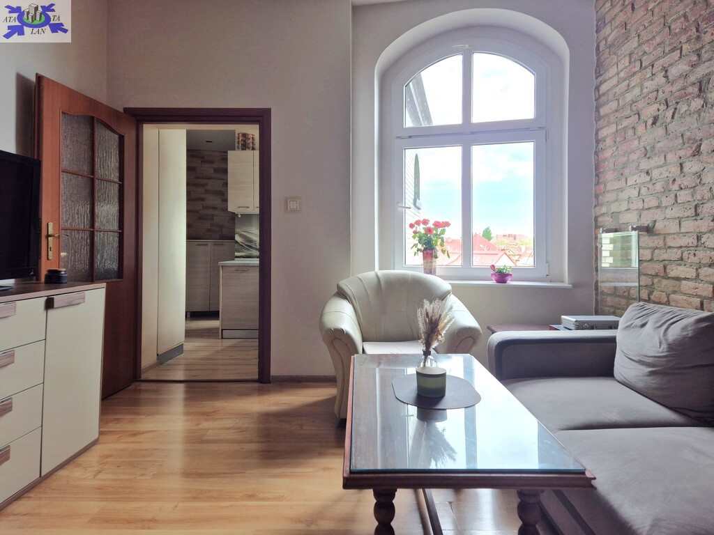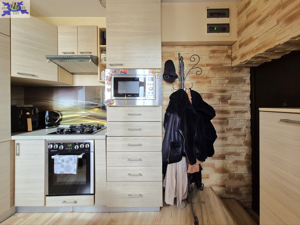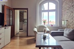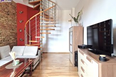 * dolny poziom przedpokój przechodzący w widną kuchnię w zabudowie z AGD, łazienka z prysznicem, umywalką, wc i pralką, pokój dzienny z wygodnym narożnikiem i komodami oraz odsłoniętą czerwoną cegłą, sypialnia z dużym łóżkiem, rozkładaną sofą i szafą na wymiar, balkon od strony cichego podwórza