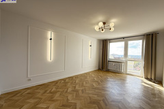 Przestronny salon z dużym oknem i wyjściem na balkon to idealne miejsce do wypoczynku i spotkań z rodziną. Jasne ściany, dębowa podłoga w jodełkę oraz nowoczesne oświetlenie tworzą przytulny, harmonijny klimat.