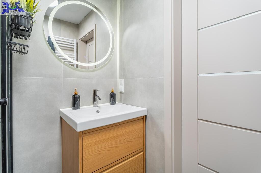Łazienka wykończona została w nowoczesnym stylu - z kabiną prysznicową, czarną armaturą i drewnianymi akcentami.