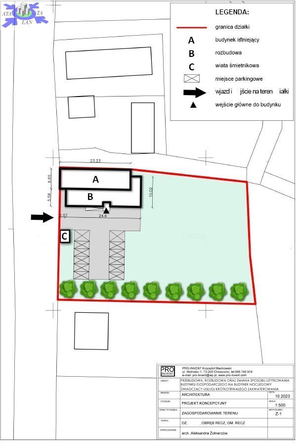 Na działce znajduje się parterowy budynek gospodarczy w bardzo dobrym stanie o powierzchni 300mkw (2 poziomy), który można przekształcić chociażby w budynek noclegowy pod usługi krótkotrwałego zameldowania. Projekt koncepcyjny z 2023 roku jest w cenie działki.