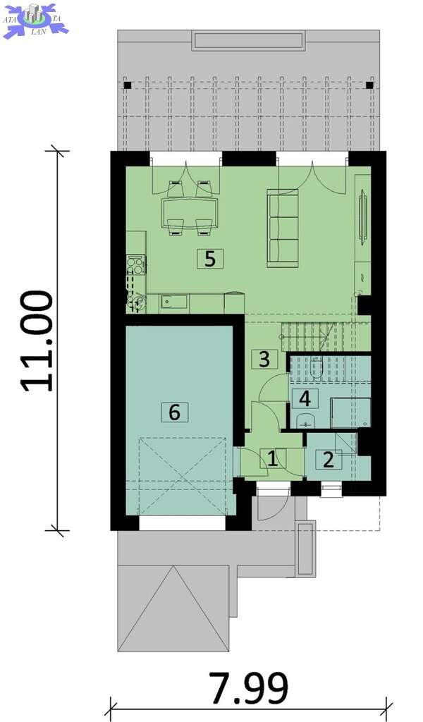 Na parterze salon z wyjściem na taras oraz ogródek, kuchnia, WC , schowek ,wiatrołap oraz garażu ok 18,5m2