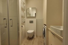 łazienka z WC (ok. 5 m2), wyposażona w prysznic, umywalkę, grzejnik drabinkowy,