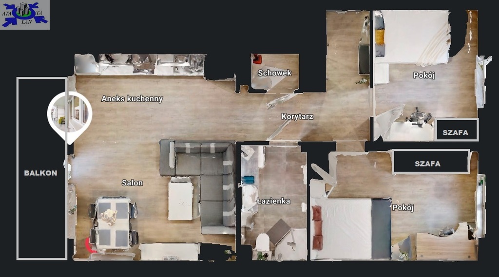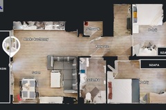 ---> Salon (rozkładany narożnik, stół z 4 krzesłami, szafka RTV)