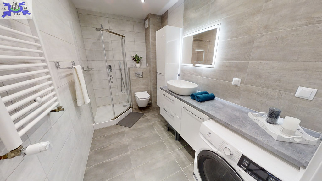 ---> Łazienka (pralka, umywalka, toaleta, kabina prysznicowa, grzejnik drabinkowy)