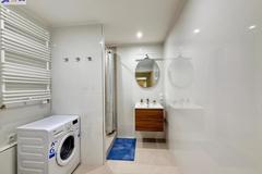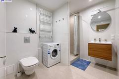 Łazienka wyposażona w prysznic, zlew, muszlę oraz pralkę automatyczną.