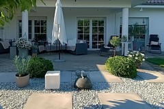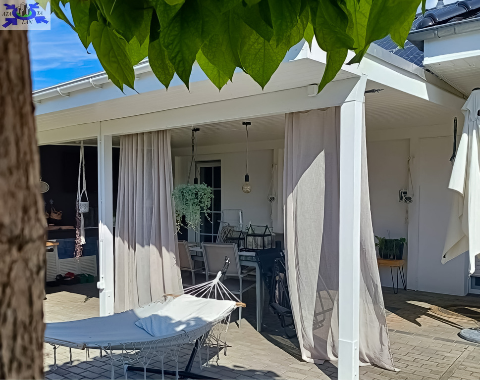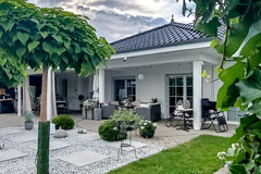 Centralnym punktem ogrodu jest duży, zadaszony taras, który w sezonie letnim staje się luksusową strefą wypoczynkową.