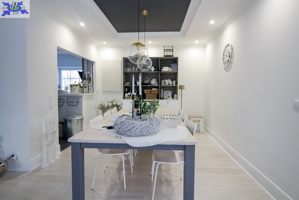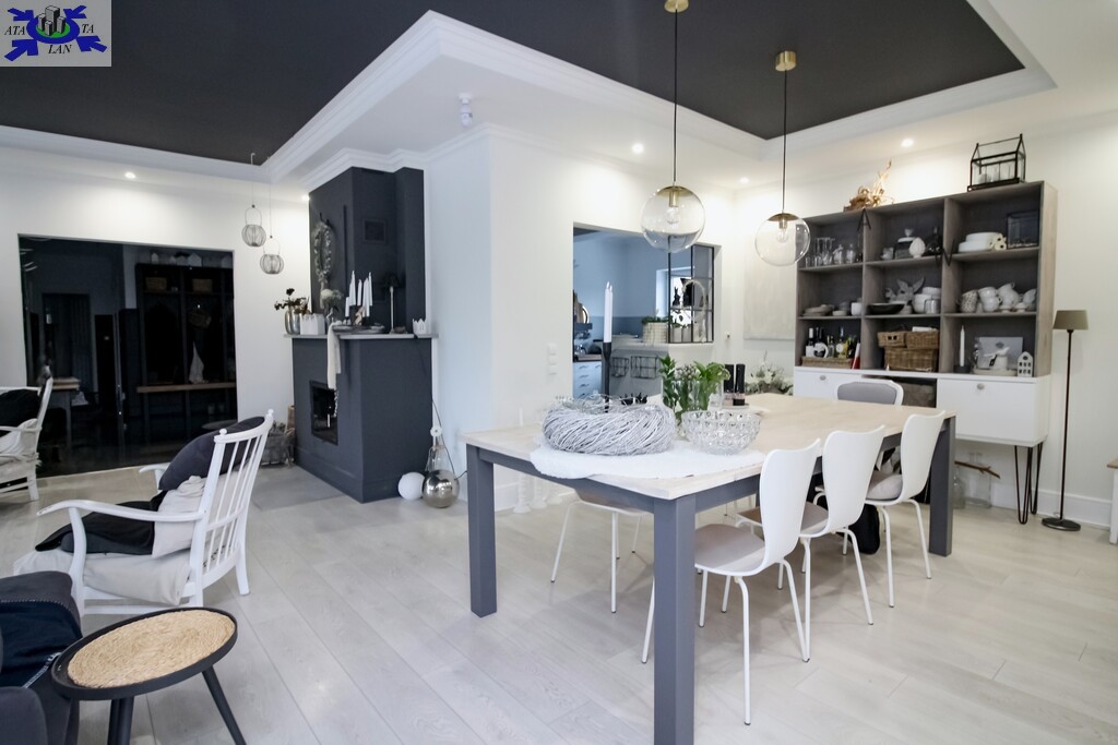 salon z dużymi przeszkleniami i pięknym widokiem na ogród , oddzielna kuchnia z przejściem do jadalni,w centralnym punkcie salonu znajduje się przestronne wejście na ogród zimowy, który zaprasza nas do wypoczynku i chwili relaksu z dala od zgiełku miasta- zachowując dużą prywatność oraz ciszę. piec gazowy będący głownym źródłem ciepła, zainstalowanae zostały panele fotowoltaicznedodatkowym źródłem ciepła może być kominek znajdujący się w salonie