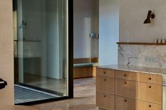2 łazienki wykończone włoskim marmurem Carrara. Wyposażone w armaturę marek premium (Axor, Laufen, Burlington, Grohe) oraz wannę wolnostojącą. W łazience prysznicowej podłogę zdobią ręcznie wypalane płytki "Gorseciki Warszawskie" (autorski projekt).